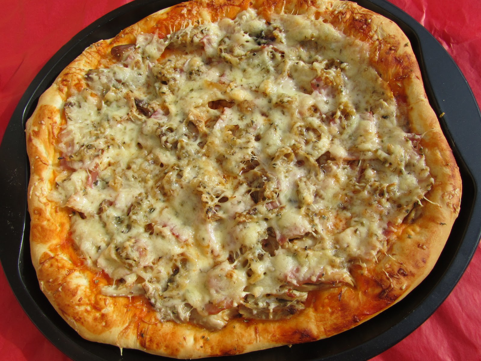 Pizza met tonijn, ui, kaas en tomatensaus