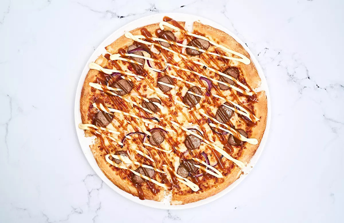 Pizza met frikandel, saus, kaas en tomatensaus